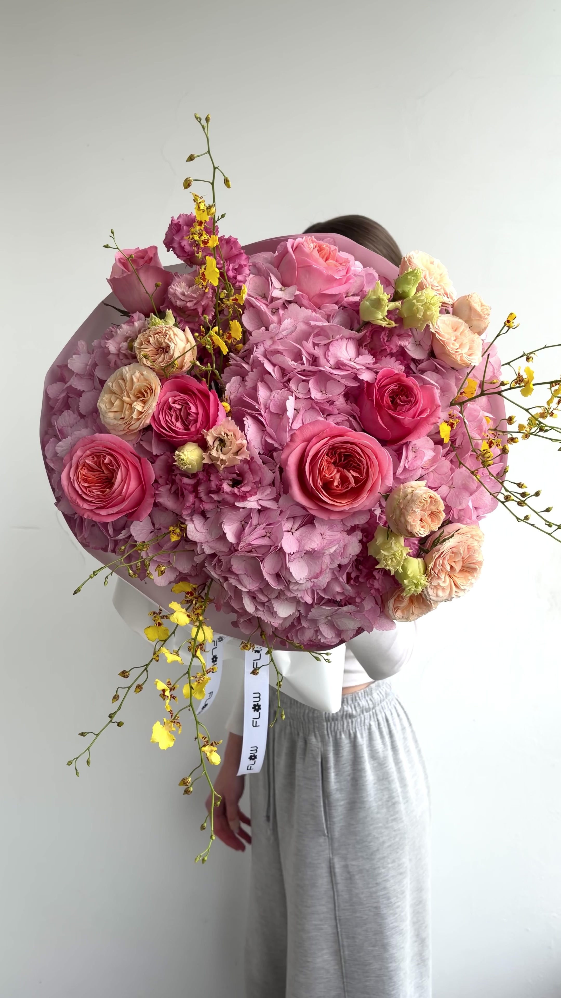 Sugar Rush is a delicate bouquet featuring pink hydrangea, spray peony roses, lisianthus, and orchid. A light and graceful composition with a fresh and airy mood.